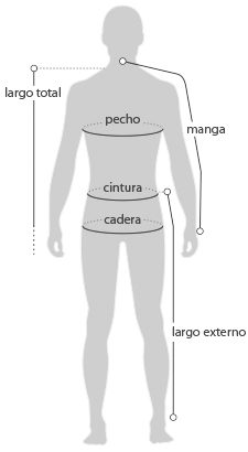 | Talle | Contorno pecho | Largo manga | Largo total |